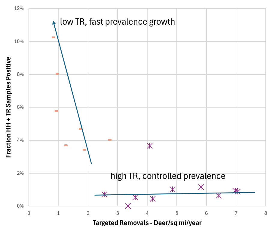 We think we have pretty strong evidence that targeted removals and increased harvest of antlerless deer (lowering population density) have a substantial effect, though not many regions have been able to fully deploy these measures. Here’s one that’s been highly effective: