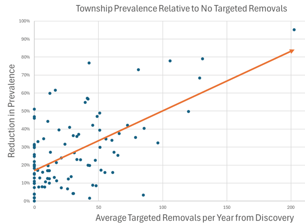 When you look at the result across lots of regions, there’s a clear pattern. More removals = lower prevalence, and even regions that received no treatment benefited due to geographic spillovers from deer dispersal.