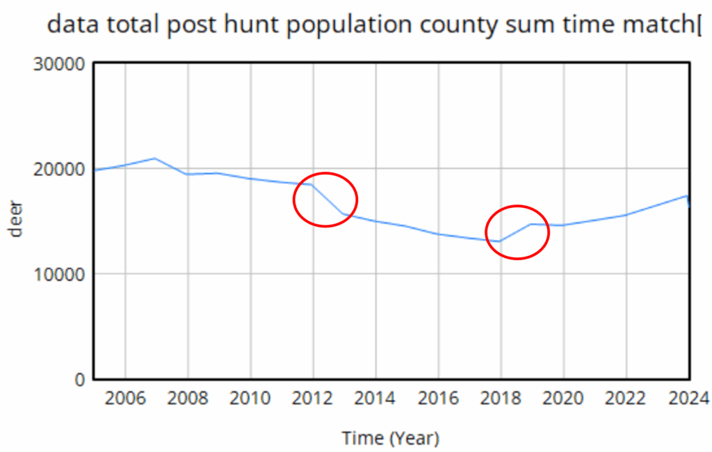 The first one is real – it’s an EHD outbreak that caused widespread mortality. That can easily be captured in the model with an exogenous event. The second one though turns out to be a change in methods, and that’s the real problem here. This deer “data” isn’t really data, it’s an accounting model with its own assumptions. Really there’s no such thing as pure data – it’s always captured through some kind of process that is effectively a model. But in this case, the model is problematic, because it changed in 2018, and we don’t know how.