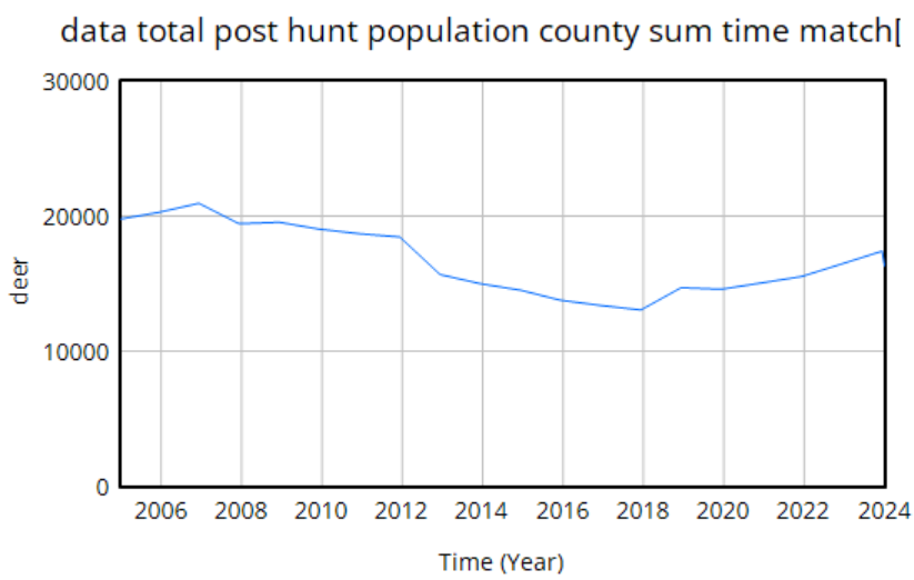 We use data heavily. The model is driven by hunter harvest and targeted removals of deer, which are fairly reliable measurement streams with long histories. We calibrate primarily against surveillance (positive CWD tests) and population data. The surveillance is very noisy because sample sizes are small, but as far as we know it’s fairly free of big systematic problems. The population data is more aggregate and less noisy. It typically looks like this: