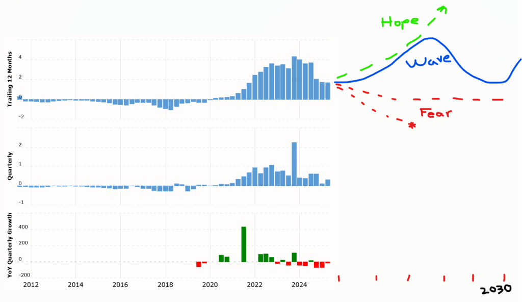 This is TSLA earnings per share in $/share (or YOY growth at bottom), with my markup on the first plot. Looking at this abstractly, it’s tempting to view it as some kind of logistic growth or overshoot-and-collapse dynamic, in which case one might fear (red) the extrapolation to negative earnings and bankruptcy, or at least something like mild decline or persistence of the status quo (which is roughly what yesterday’s earnings did). However, the stock market clearly hopes (green) for something else: the PE ratio in the hundreds indicates an expectation of resumed exponential growth to well above 10x recent earnings. One might also notice some cyclical peaks and troughs and hypothesize future oscillations (blue).